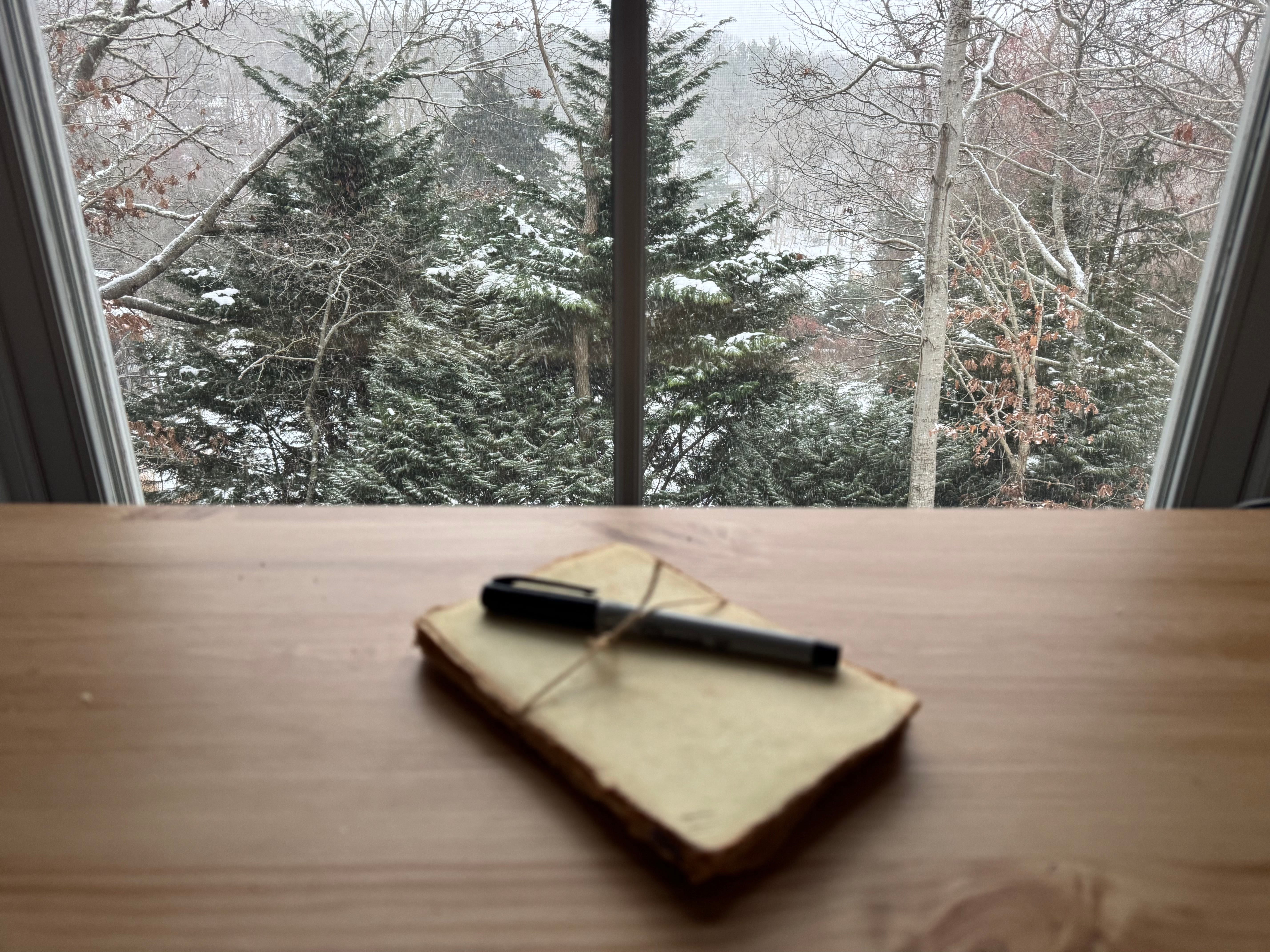 We woke up to snow again yesterday. It didn’t amount to much by way of the ruler, but how it stirred the heart. Who knew we’d move down here and have so many snowstorms? Each feels like grace, each brings a delightful enchantment to two old dogs and one old man.