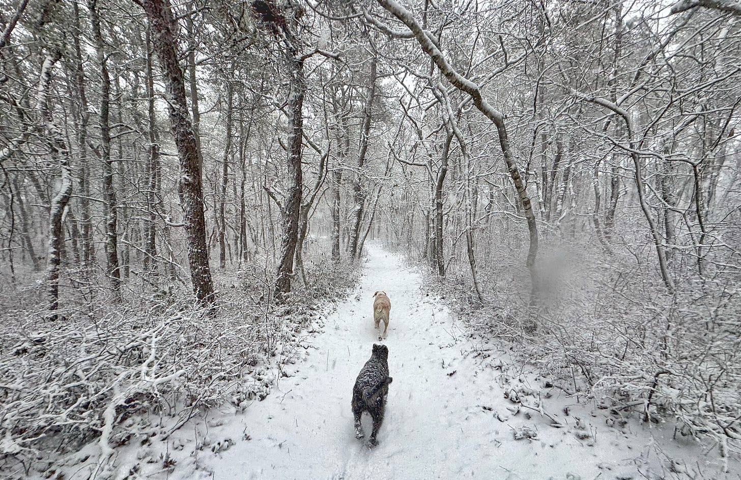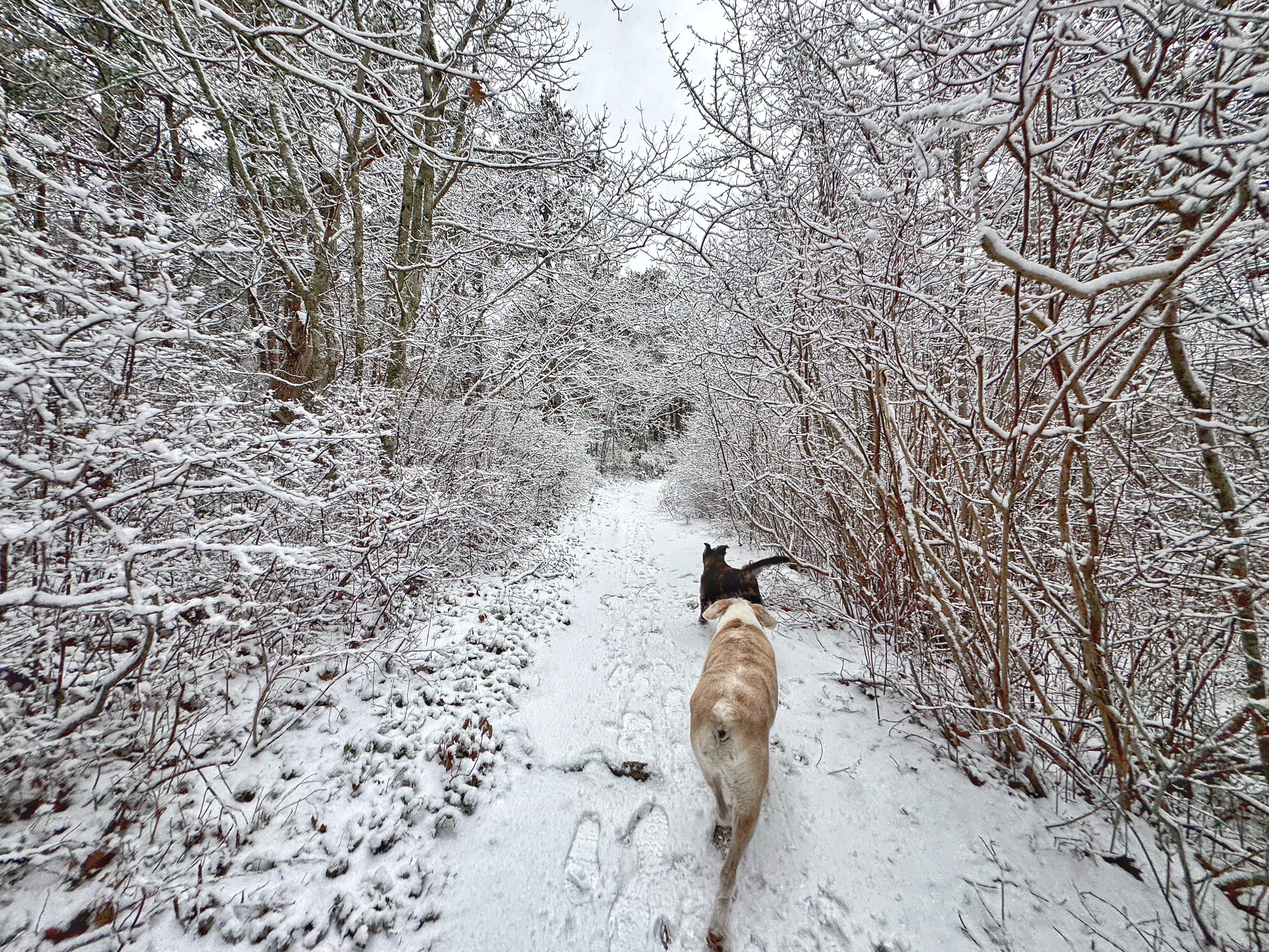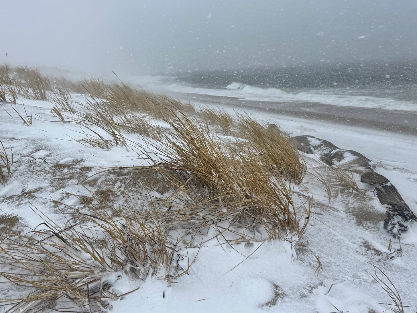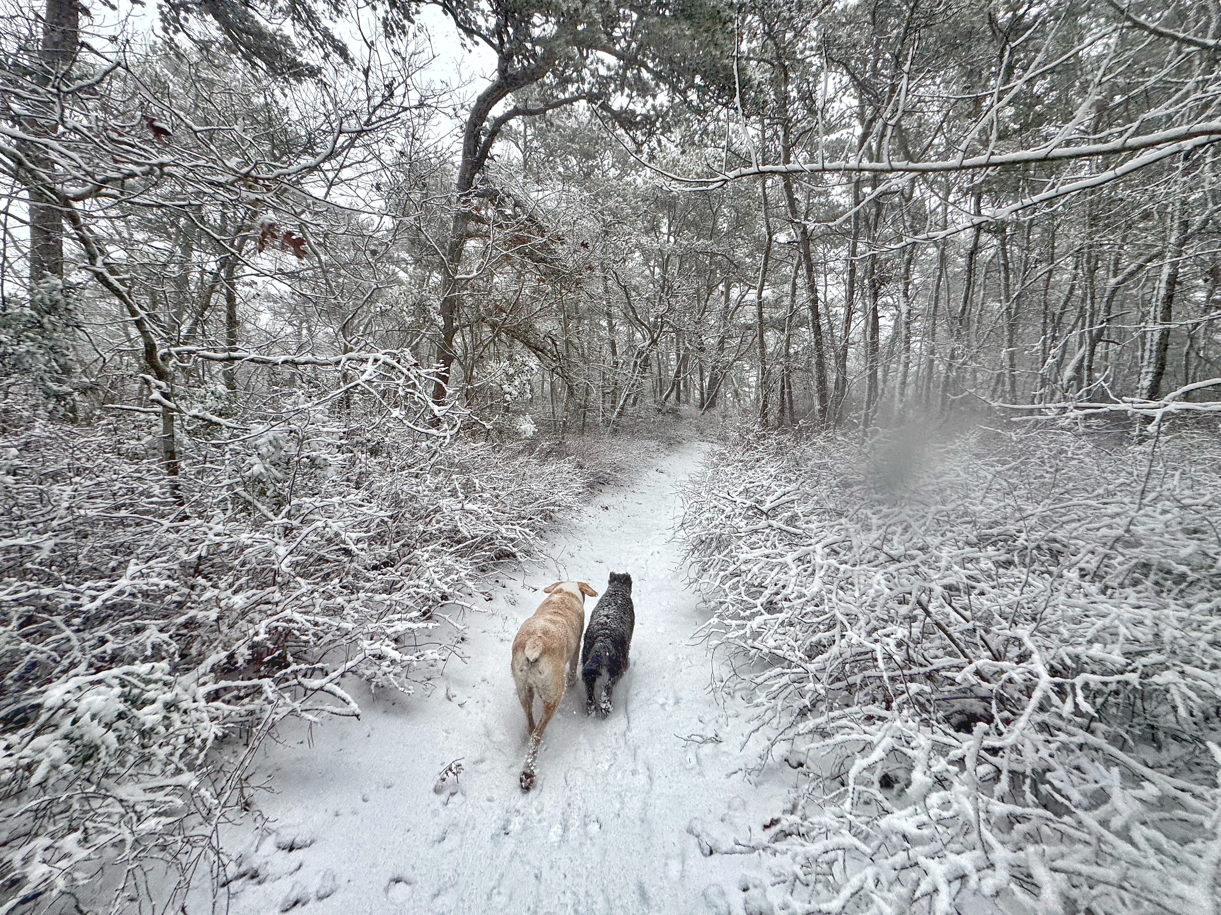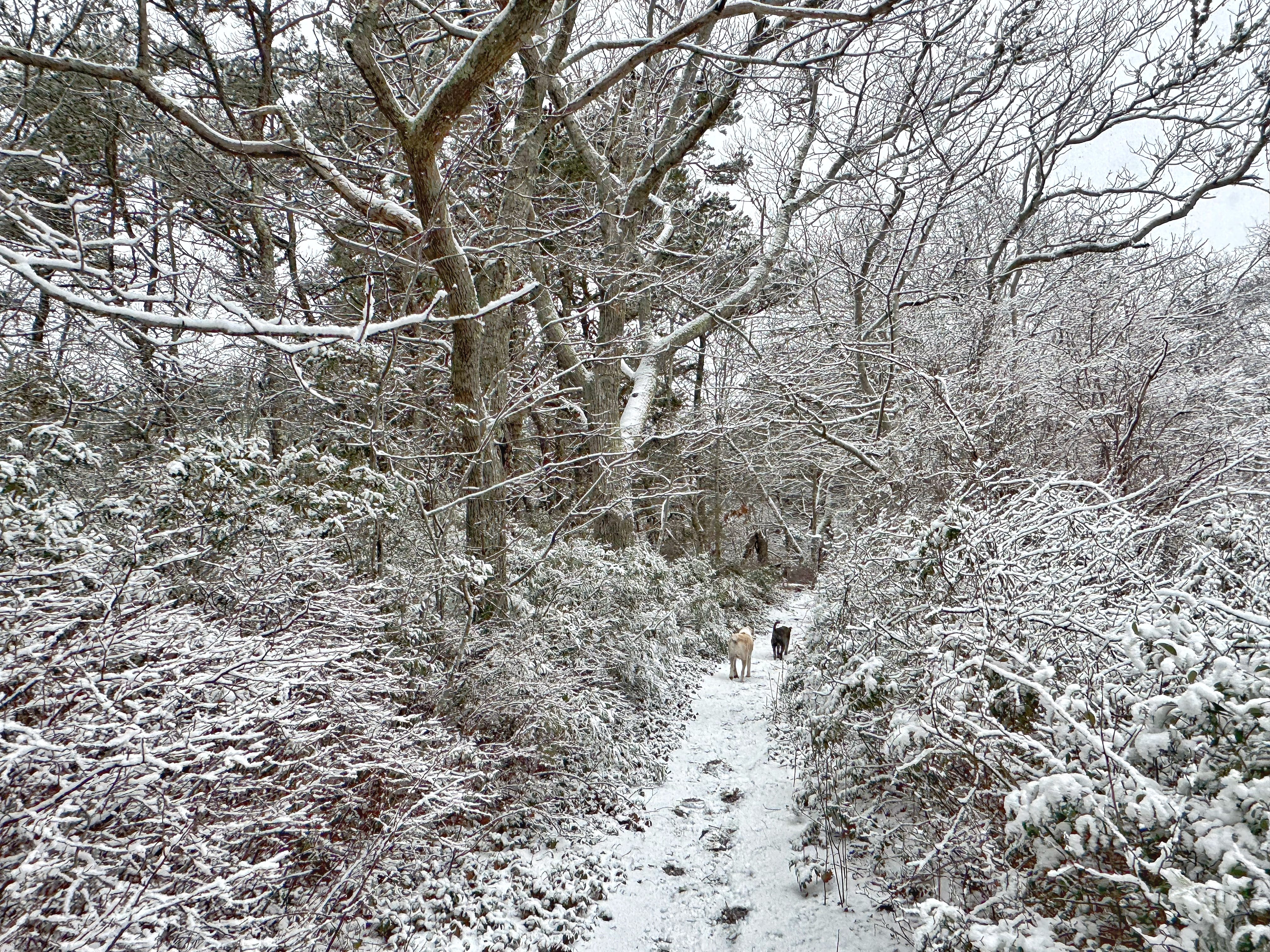 We drove to our favorite Provincetown trailhead, and fat flakes began to drift lazily around us. For the first mile and a half, it stayed like that. However, the last two and a half miles became an actual winter storm. It swallowed us whole, and we relished the experience.
